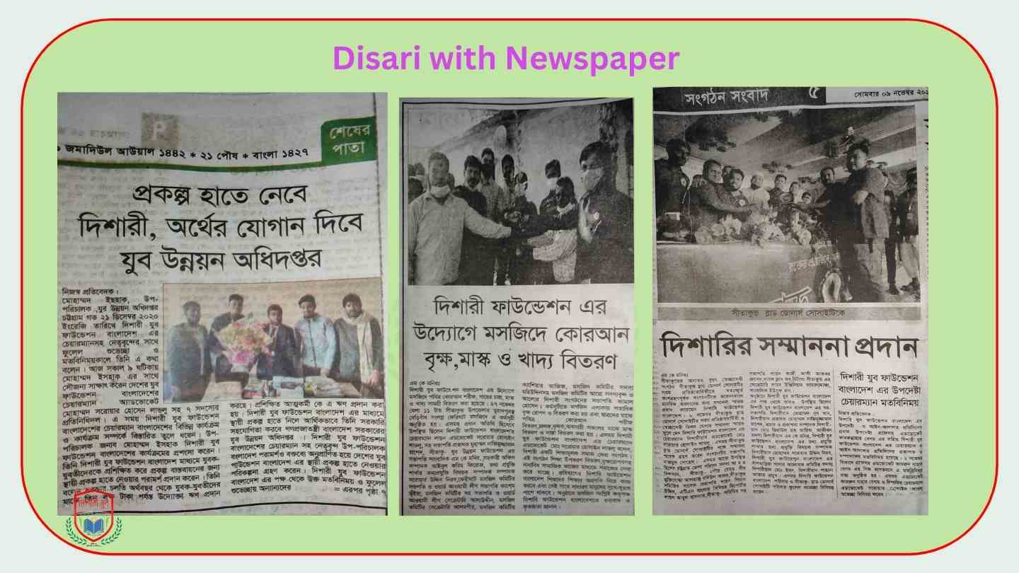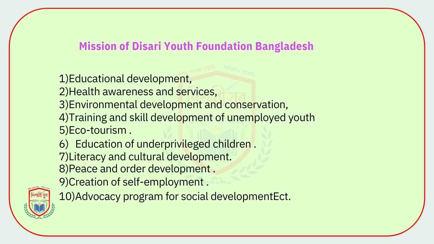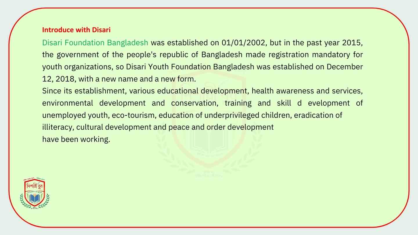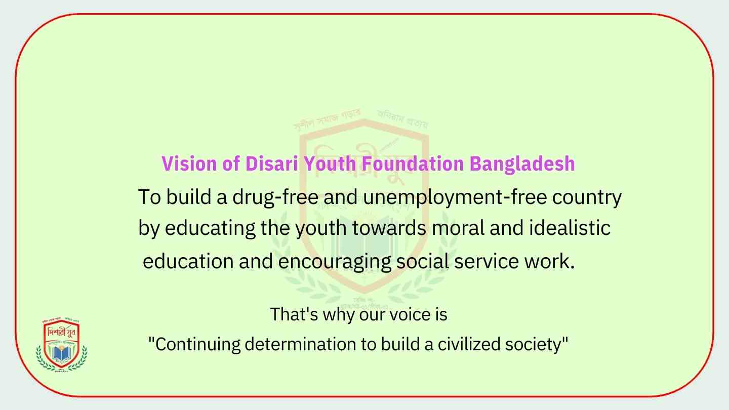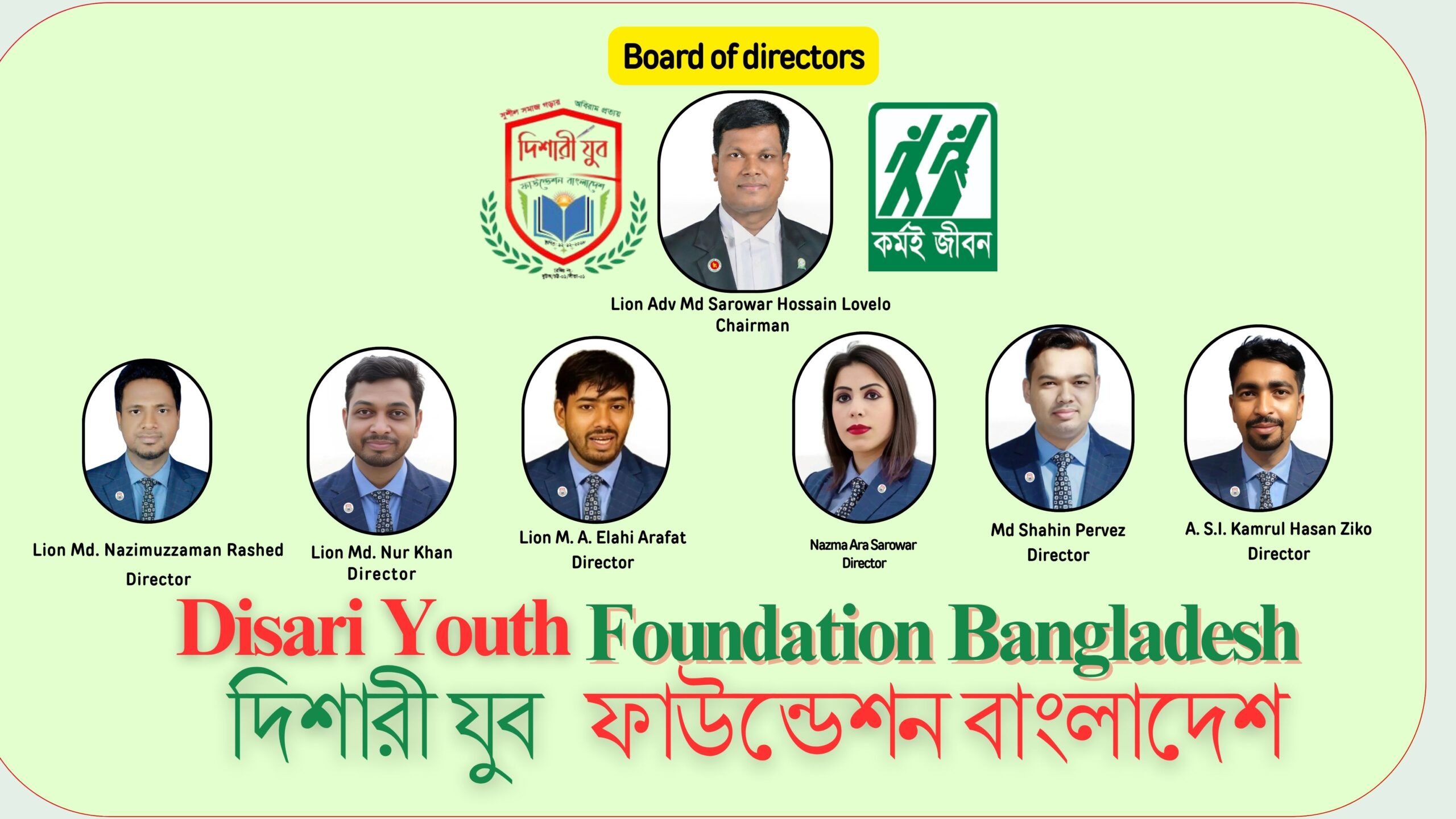 The decision to register with the Department of Youth Development was taken by the Board of Directors on 1 March 2019 and this organization is a part of Disari Foundation Bangladesh. Will act as. However, Disari Youth Foundation Bangladesh will be run as an independent organization.