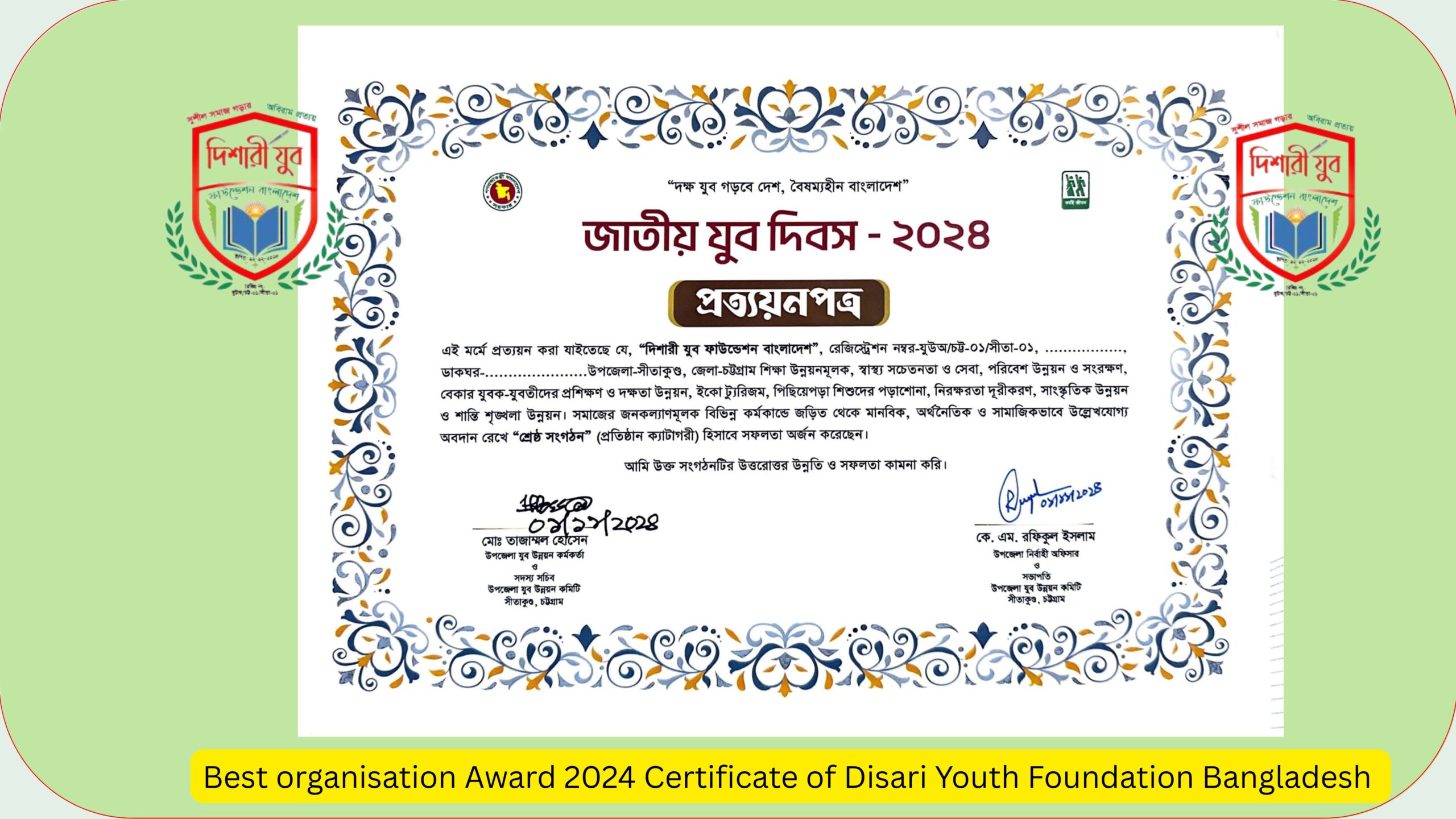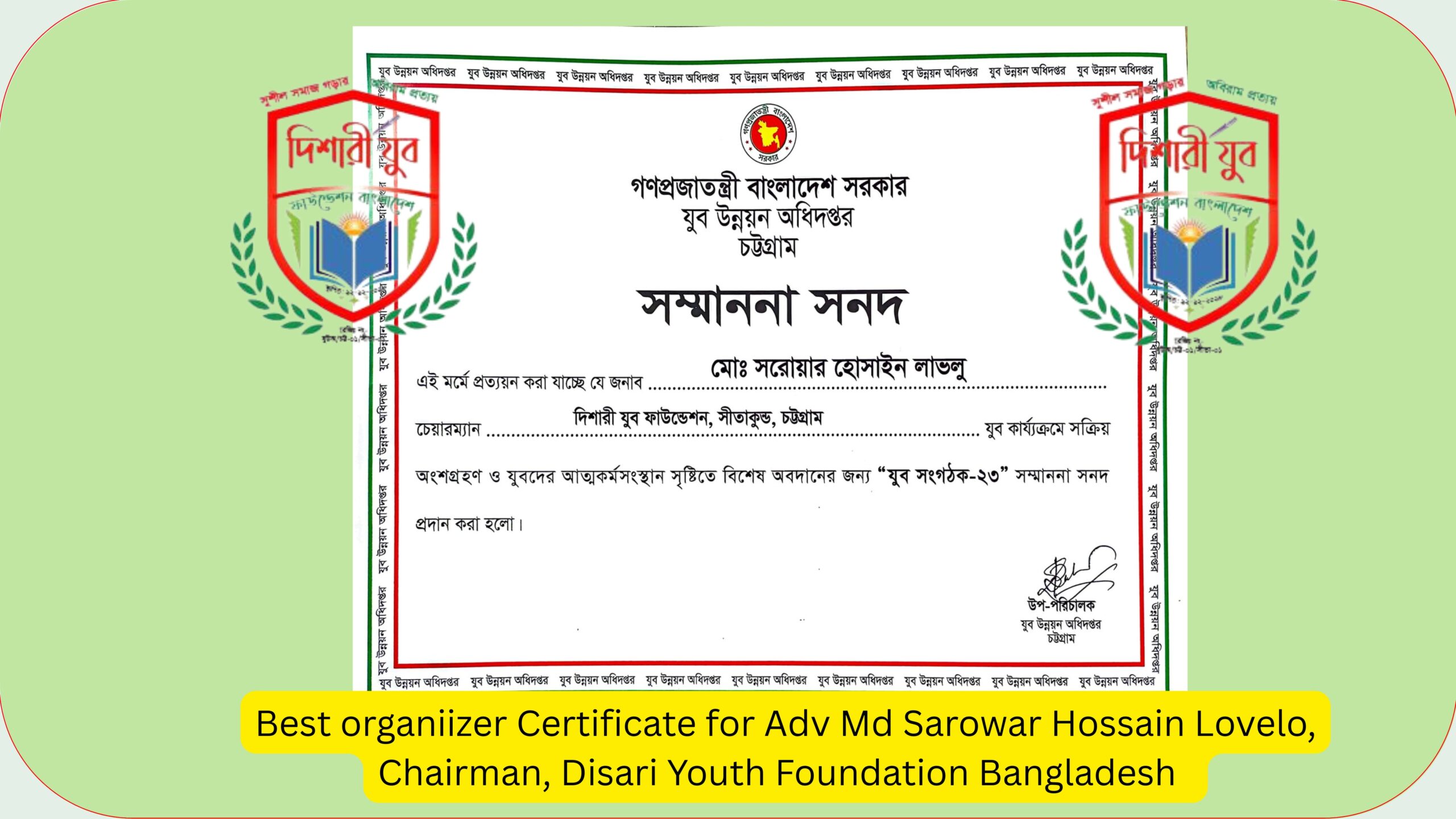 On 24/02/2020, Dishari Youth Foundation Bangladesh became the first youth organization to get online registration under the online registration program in Bangladesh under the Department of Youth Development.