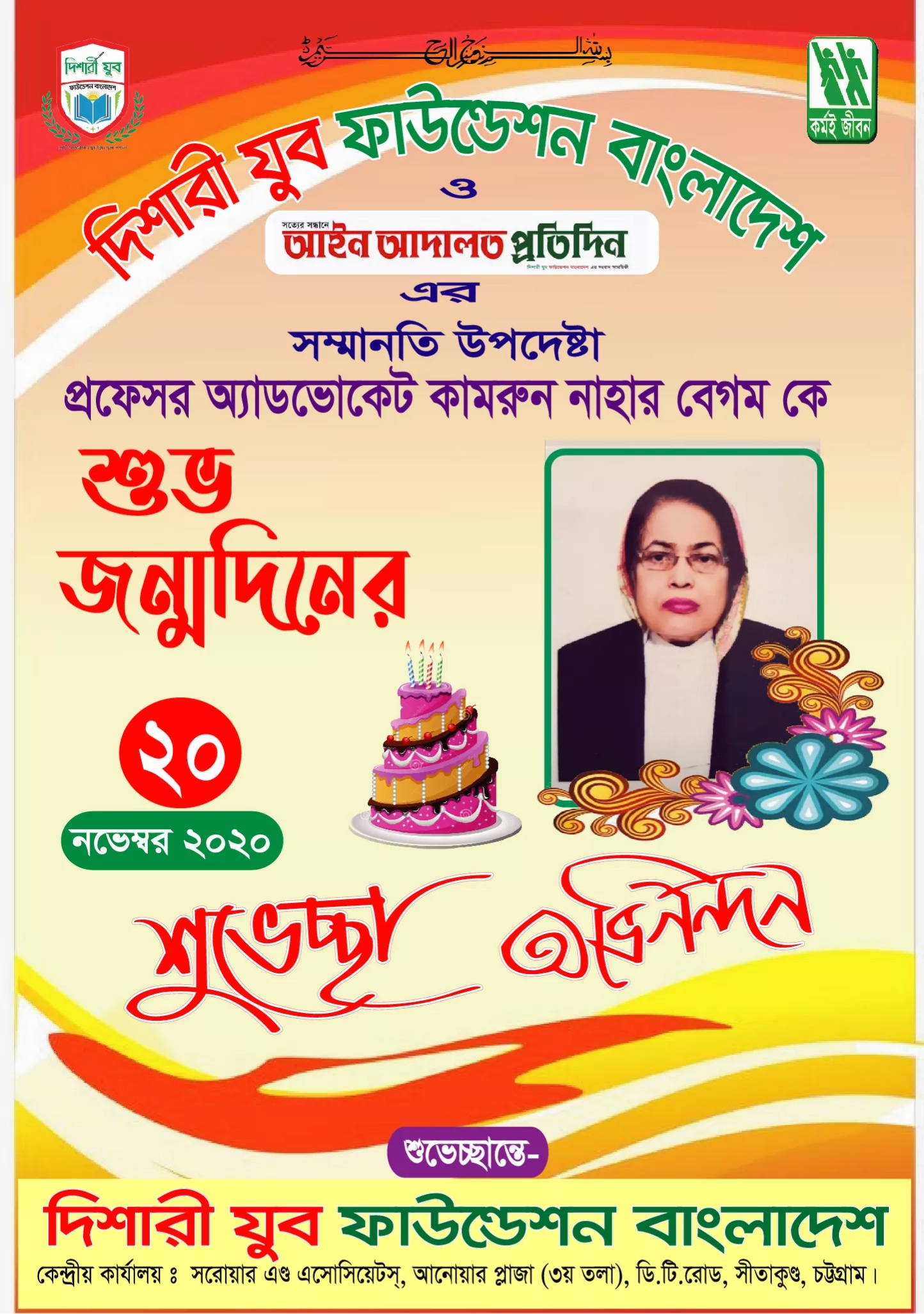 আজ ২০ নভেম্বর ২০২০ ইংরেজী দিশারী যুব ফাউন্ডেশন বাংলাদেশ এর উপদেষ্টা ও আইন-আদালত প্রতিদিনের প্রধান উপদেষ্টার প্রফেসর অ্যাডভোকেট কামরুন নাহার বেগম এর শুভ জন্মদিন। শুভ জন্মদিন উপলক্ষে দিশারী যুব ফাউন্ডেশন বাংলাদেশের পক্ষ থেকে শুভেচ্ছা জানান দিশারী যুব ফাউন্ডেশন বাংলাদেশ এর চেয়ারম্যান লায়ন অ্যাডভোকেট মোহাম্মদ সরোয়ার হোসেন লাভলু, সাধারণ সম্পাদক এস এম মাসুদ রানা, সহ-সভাপতি প্রভাষক মোহাম্মদ নাজিমউজ্জামান রাশেদ, মোহাম্মদ নূর খান, এপেক্সিয়ান আশরাফুল আলম ভূঁইয়া, সাংগঠনিক সম্পাদক এমিলি আরাফাত, প্রচার ও প্রকাশনা সম্পাদক মোঃ জিয়াউল হক আরিফ,