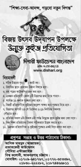 ডিসেম্বর মাসজুুুুড়ে দিশারি ফাউন্ডেশন এর উদ্যোগে ও প্রথম প্রহর ফাউন্ডেশনের সহযোগীতায় এবং প্রভাত ফেরি ও সীতাকুণ্ড যুব উন্নয়ন ফাউন্ডেশন এর যৌথ অংশগ্রহণে দিনব্যাপী এই কর্মসূচী পালন করা হবে।নিছে প্রতিযোগীদের জ্ঞাতার্তে কুইজ ও চিত্রাংকন প্রতিযোগীতার নিয়মাবলী উল্লেখ করা হলো।