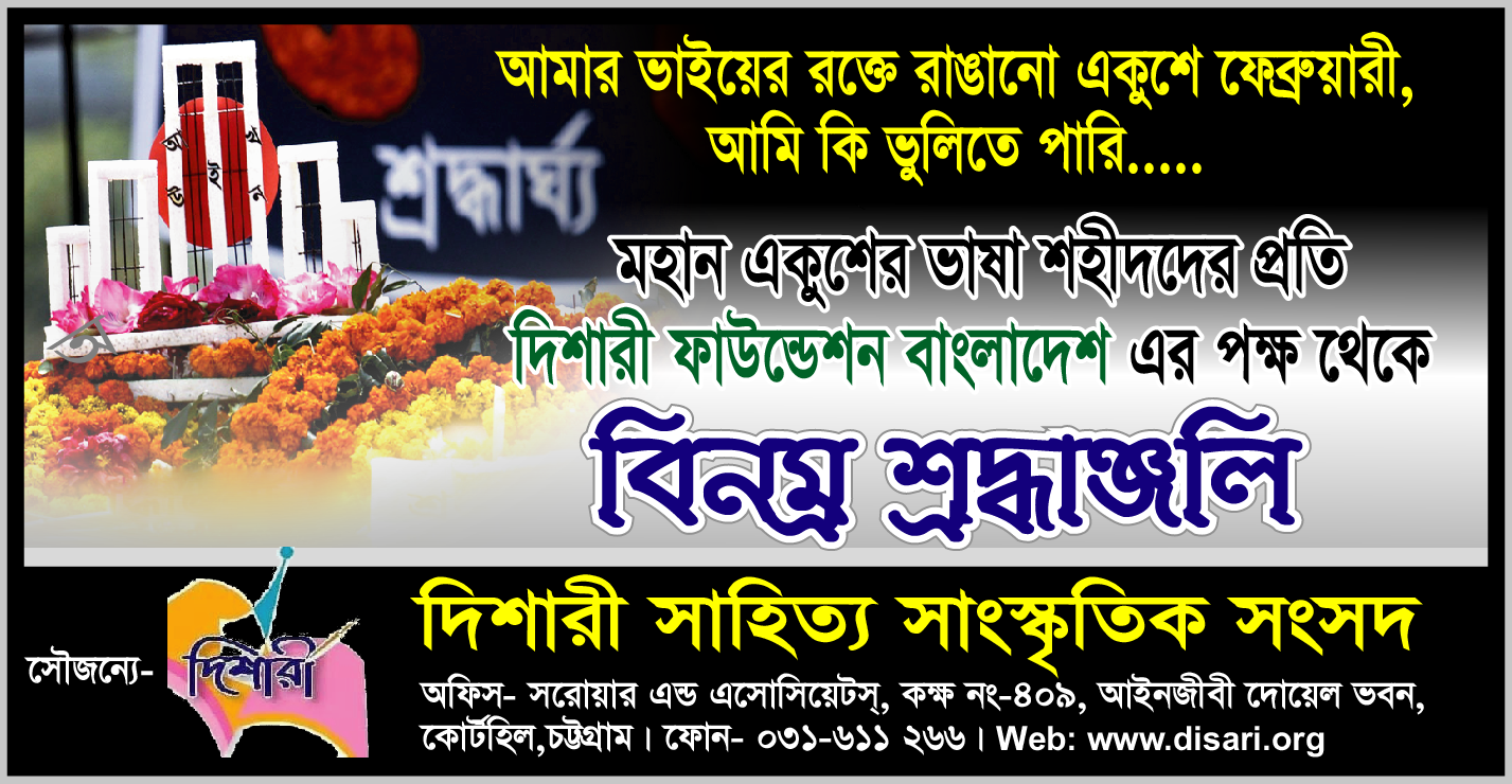 মহান একুশের ভাষা শহীদদের প্রতি দিশারী ফাউন্ডেশন বাংলাদেশ এর পক্ষথেকে বিনম্র শ্রদ্ধাঞ্জলী! সৌজন্যে - দিশারী সাহিত্য সাংস্কৃতিক সংসদ। অফিস- সরোয়ার এন্ড এসোসিয়েটস্, কক্ষ নং-৪০৯, আইনজীবী দোয়েল ভবন, কোর্টহিল,চট্টগ্রাম। ফোন- ০৩১-৬১১ ২৬৬।