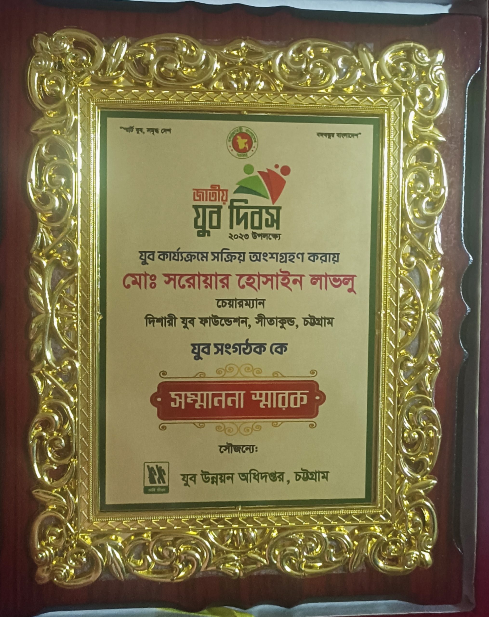 participation in the activities of the Youth Development Department, was awarded the crest by the chief guest of the program, Chittagong Divisional Commissioner, Chittagong Division. Mohammad Tofail Islam and Chittagong District Youth Development Officer Prajesh Kumar Saha presented the certificate of honour. Apart from this award,
